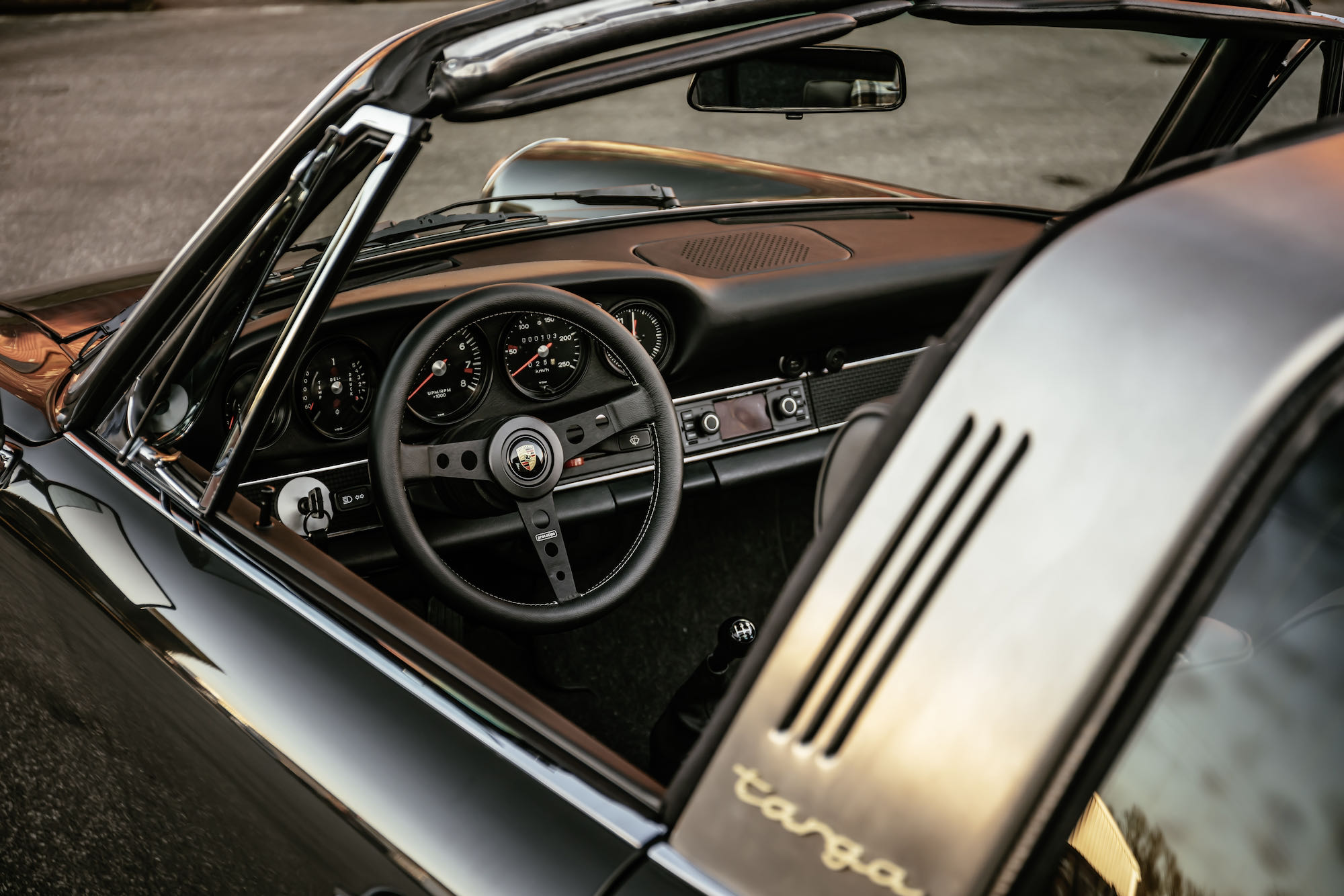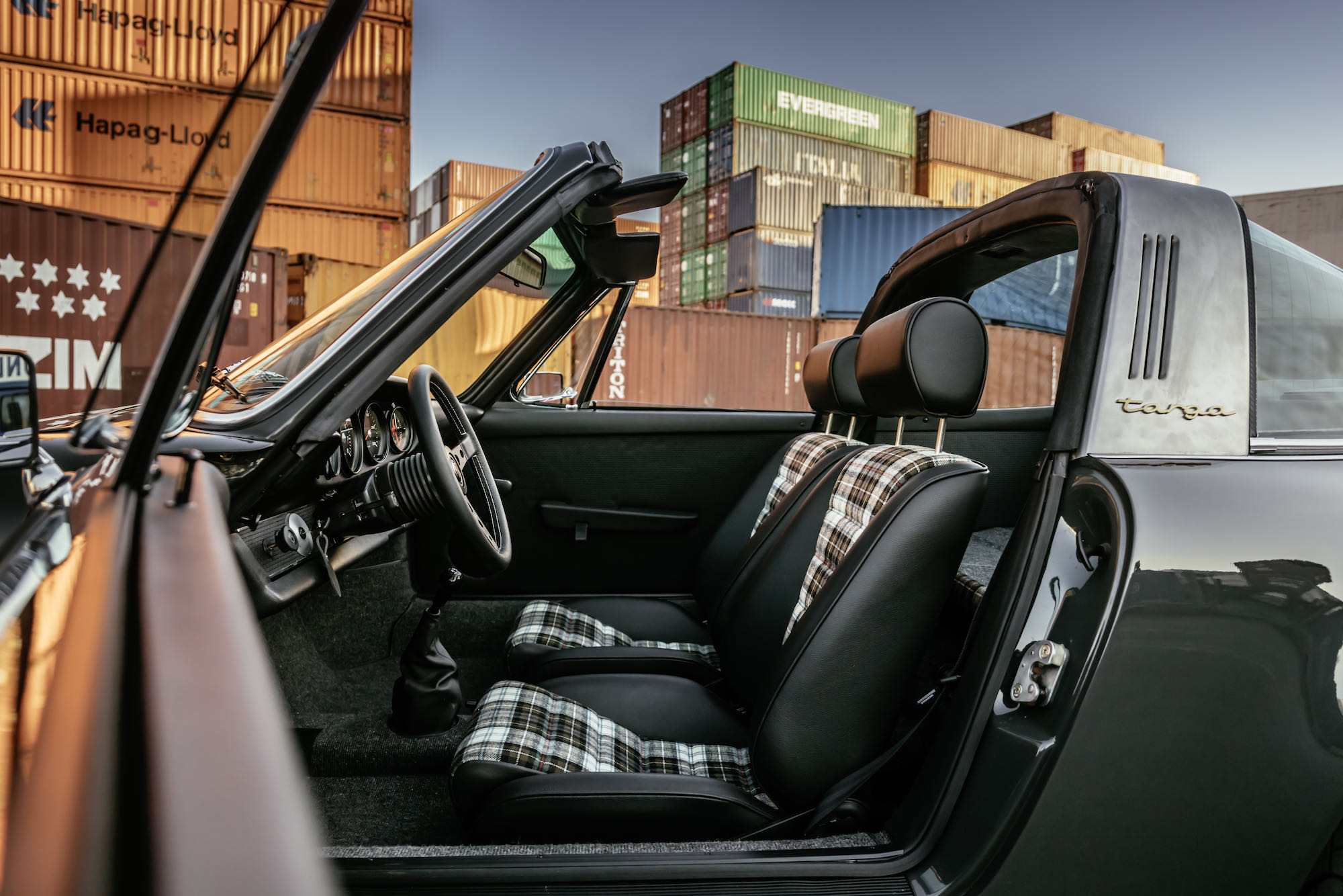 Im Bereich des Interieurs wurde die klassische Außenfarbe stilsicher durch schwarzes Leder und einen zeitgenössisches Porsche-Schottenkaro ergänzt. Alle Details, wie das Momo Prototipo Sportlenkrad, die Rundinstrumente oder auch der Schaltknauf sind ebenfalls dunkel und in schwarz gehalten.